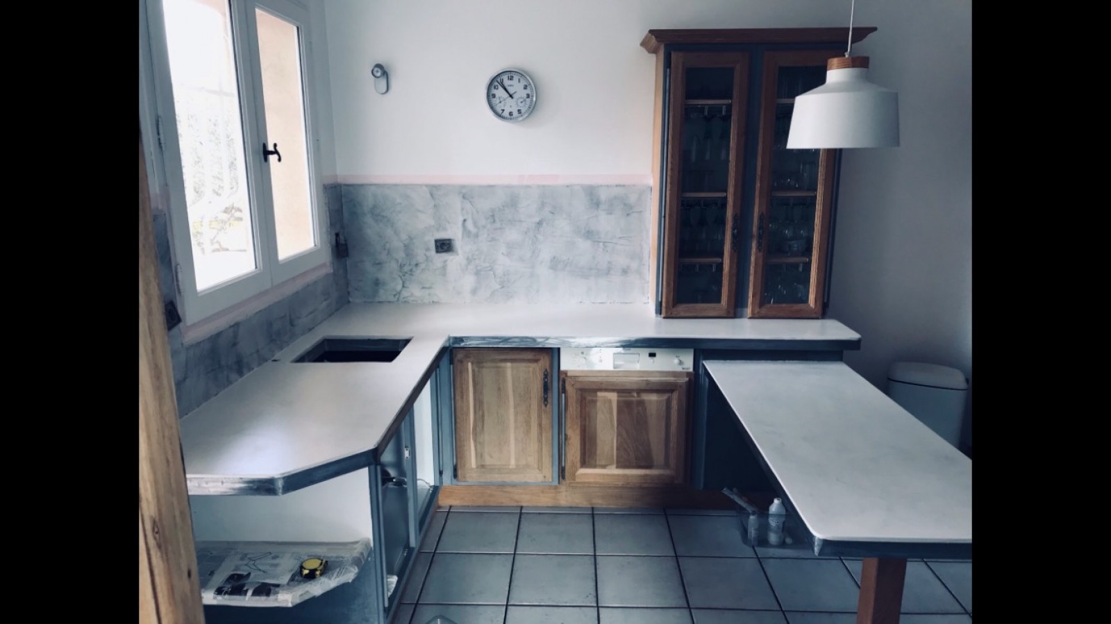 Nous avons donc appliqué du béton ciré sur un plan de travail, une table de cuisine, une crédence et une vasque intérieure ronde.