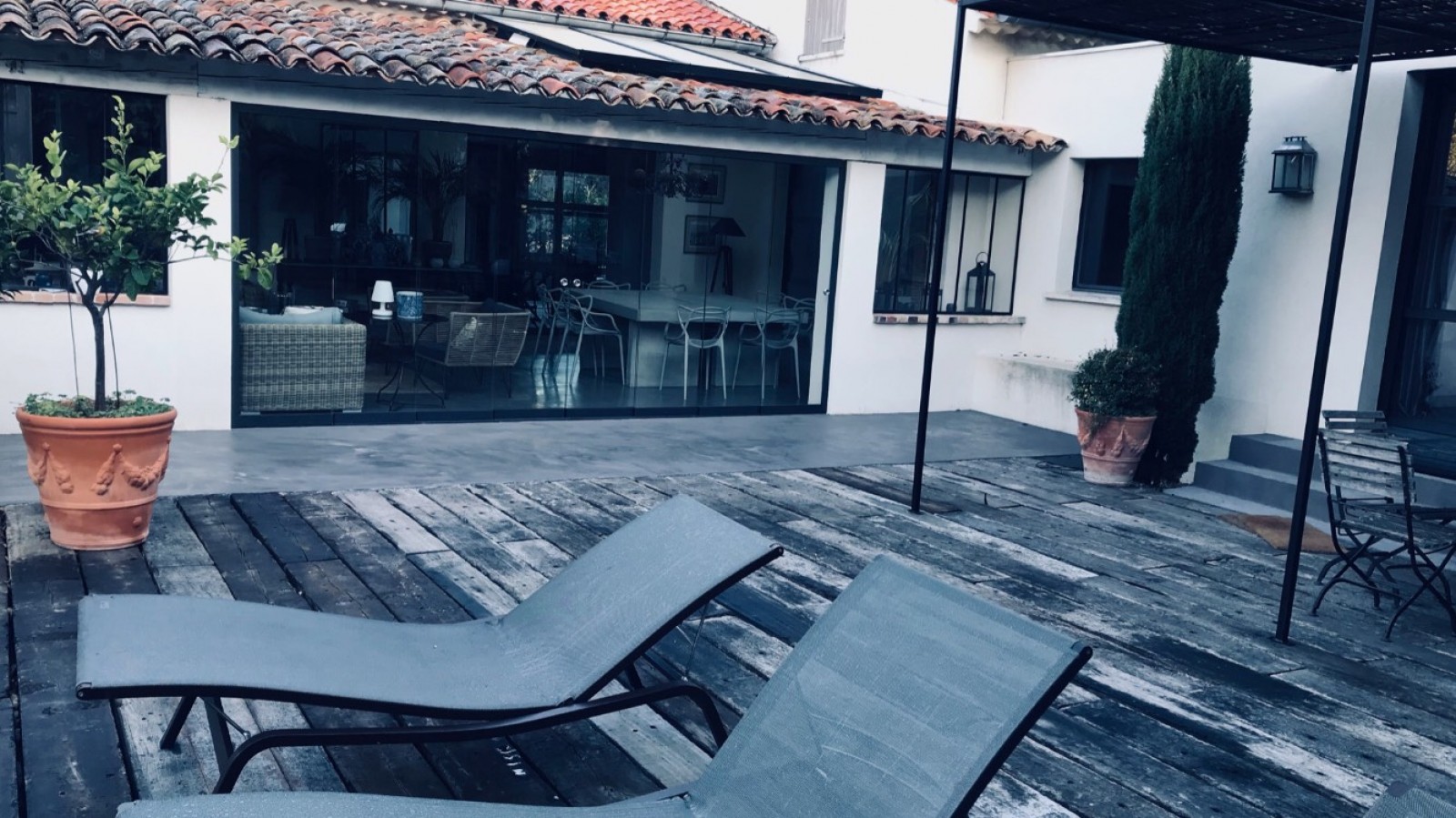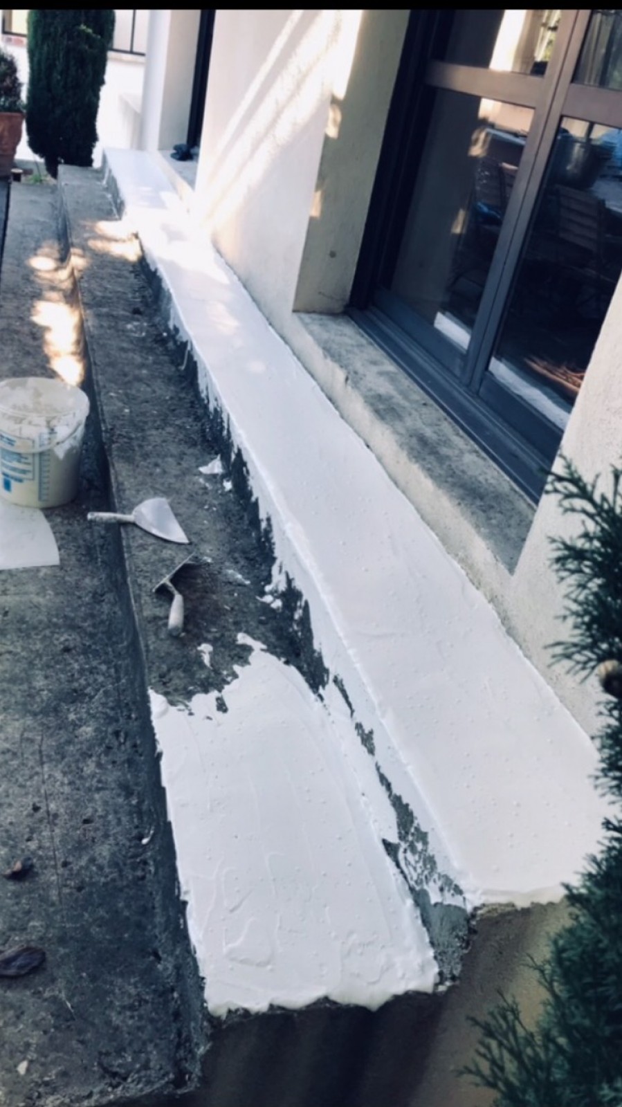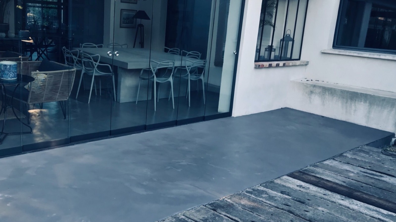 Sur la terrasse en extérieur de quinze mètres carrés, j'ai coulé un réagréage pour mettre à niveau avant d'appliquer le béton ciré moka.