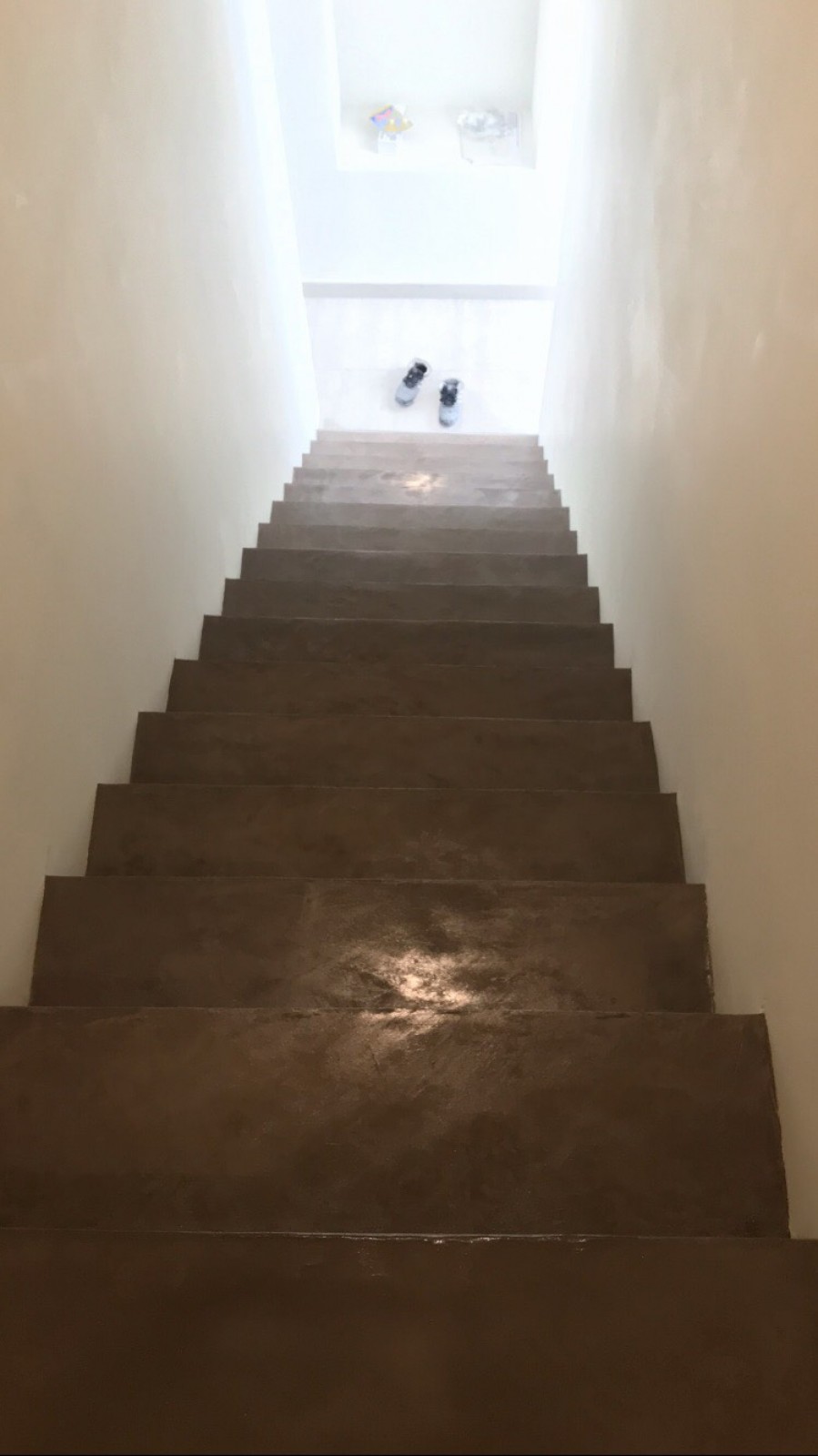 Pour l'escalier intérieur, j'ai appliqué une sous-couche d'impression fixante avec de la poudre de marbre sur le granit existant afin d'assurer un bon accrochage au béton ciré. Après la pose de béton couleur moka, j'ai protégé la matière avec un vernis satiné.