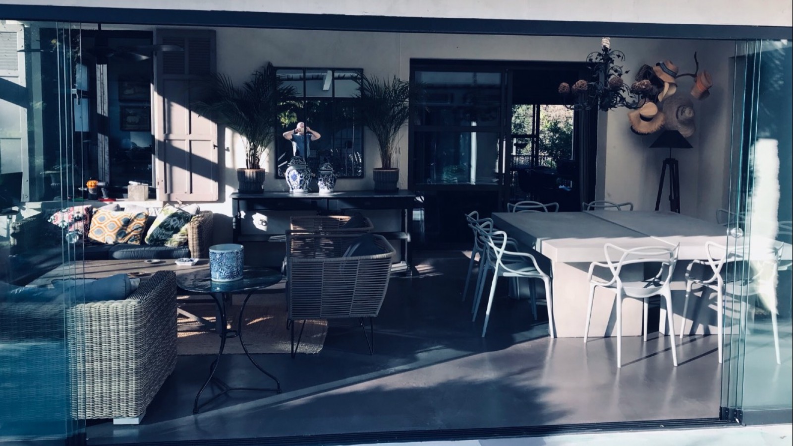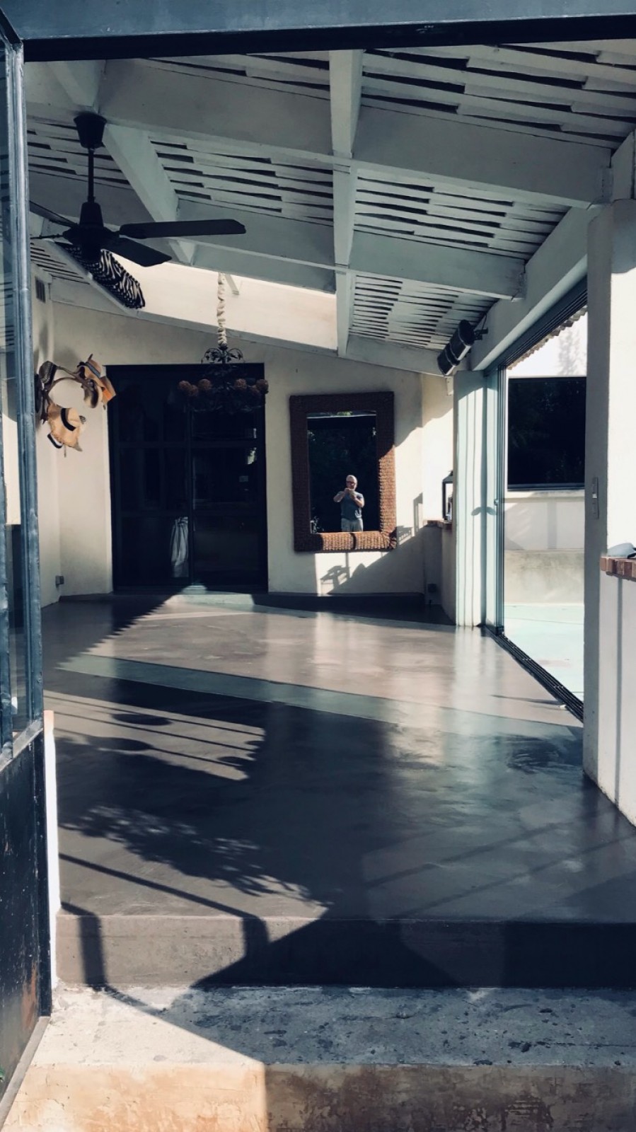 Pour la véranda intérieure, j'ai procédé à la même opération sur les dalles que pour l'escalier de granit avant d'appliquer trois couches de béton ciré de la même couleur. J'ai protégé avec trois couches de vernis pour solidifier le béton ciré.