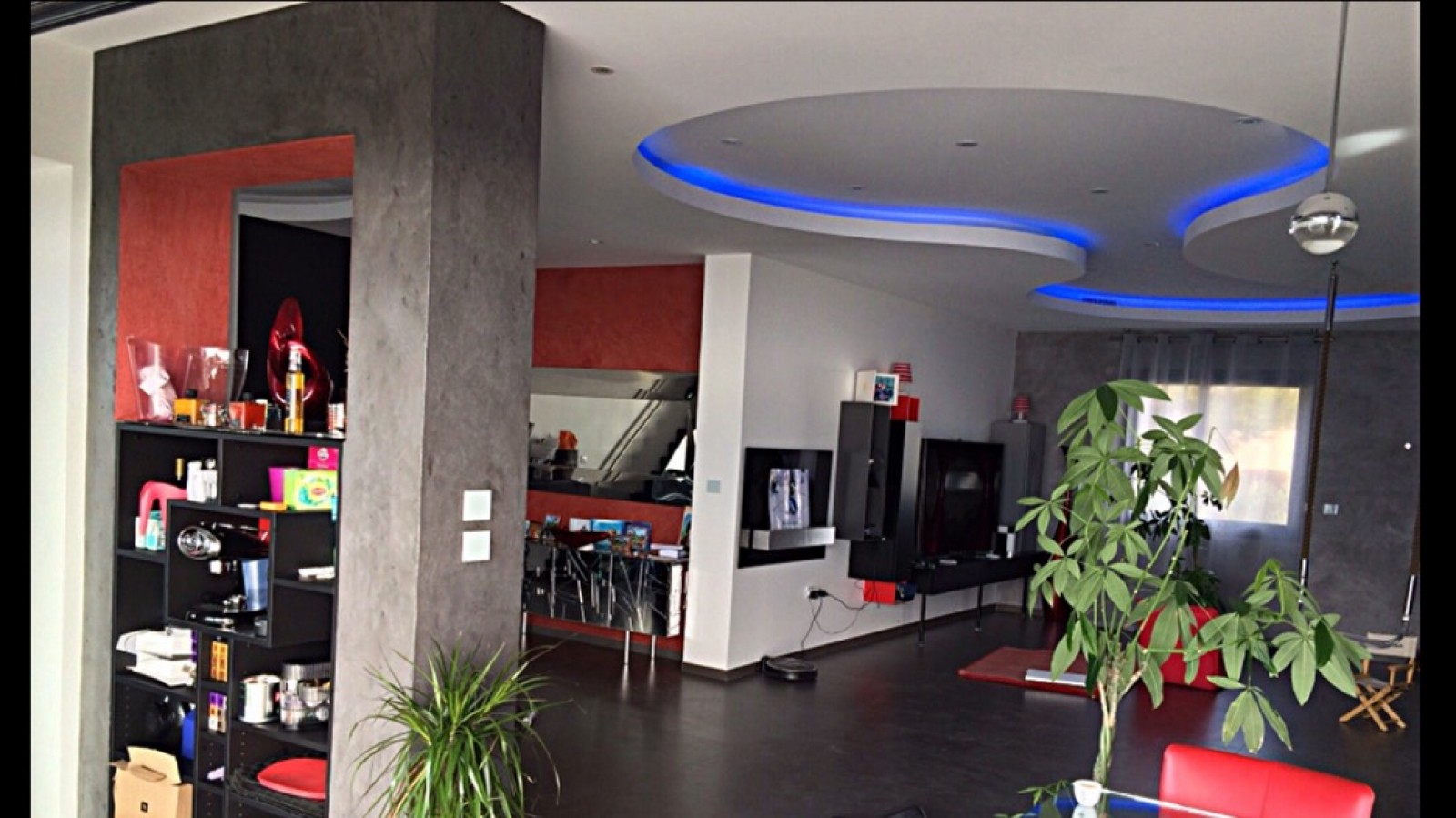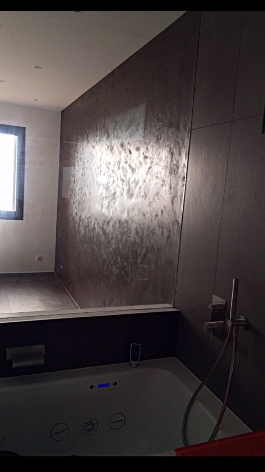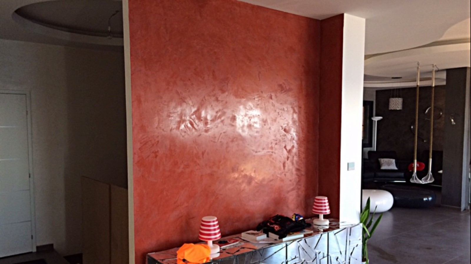 J'ai présenté mes échantillons de béton ciré et le client a choisi une dominante de gris anthracite et rouge. Il m'a laissé l'initiative du style de décoration .