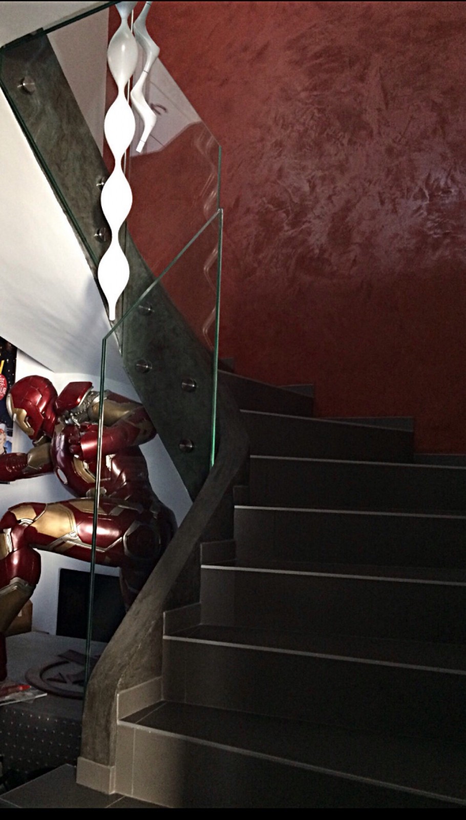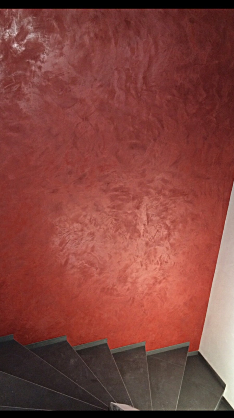 Sur l'escalier qui descend au rez-de-chaussée, j'ai appliqué deux couleurs : ton pierre et rouge Pompéi.