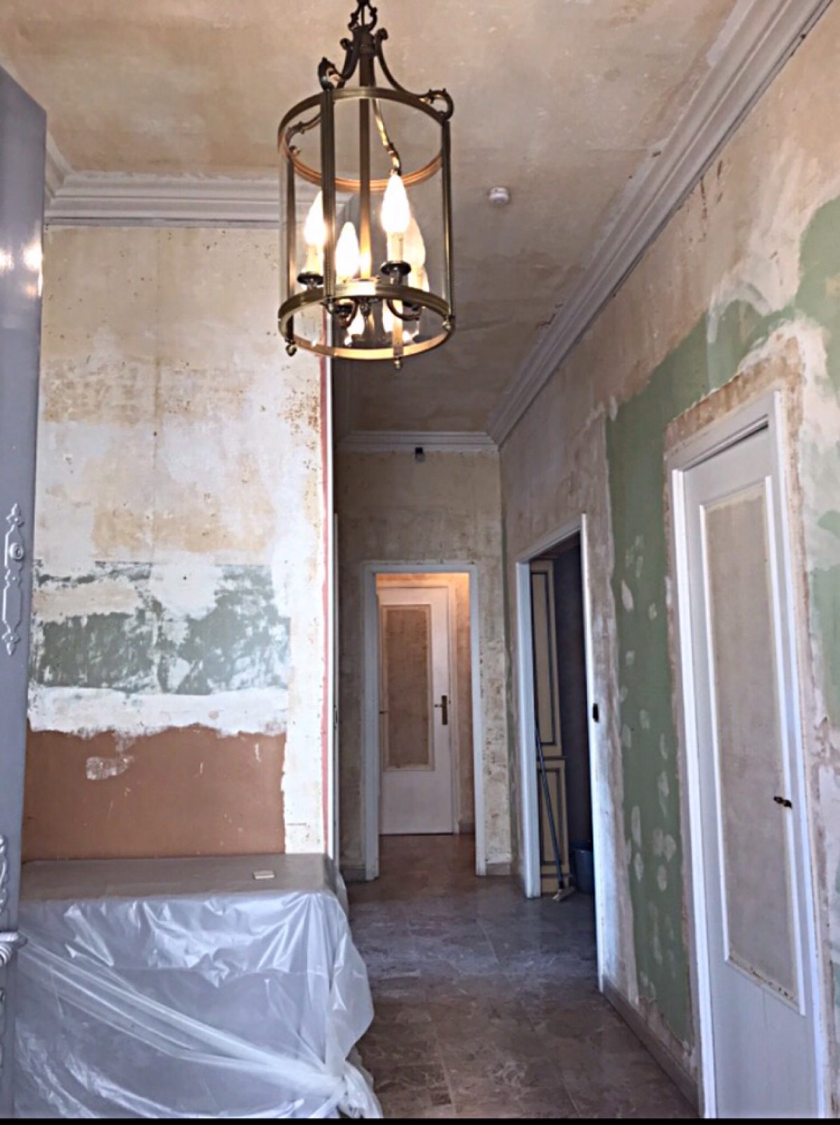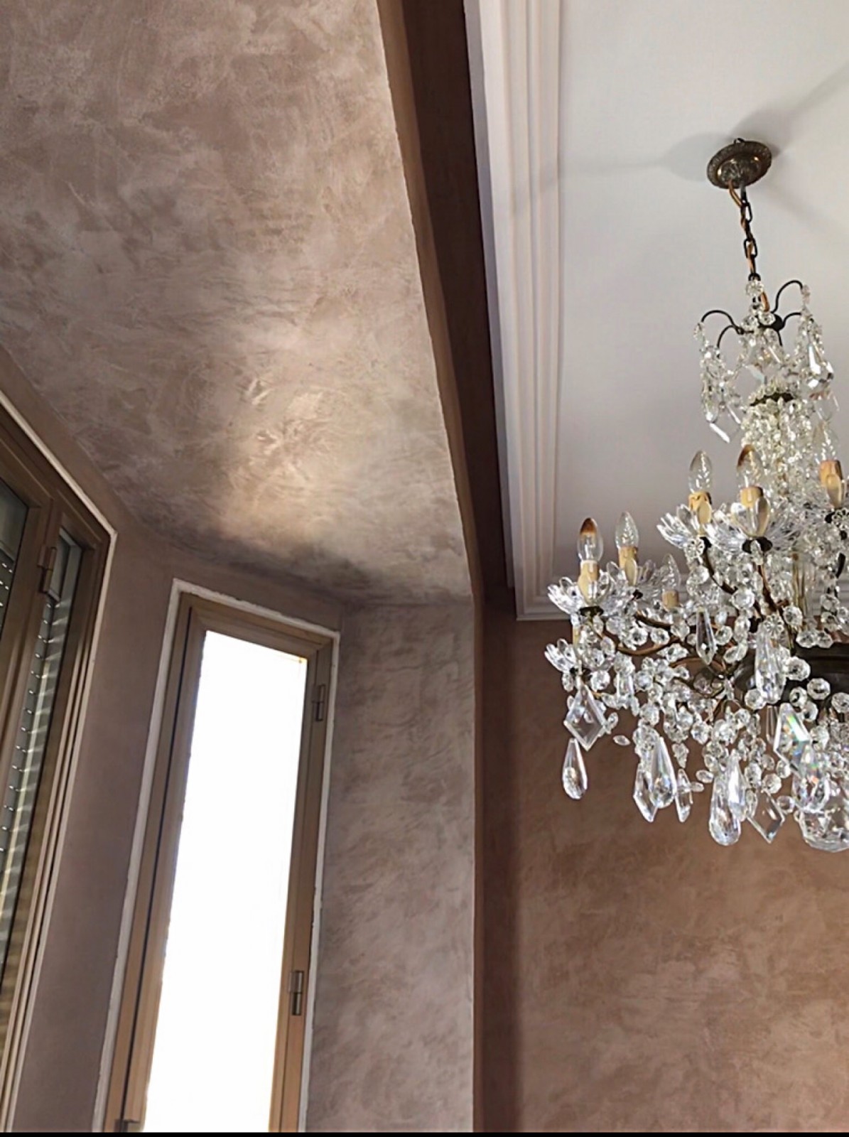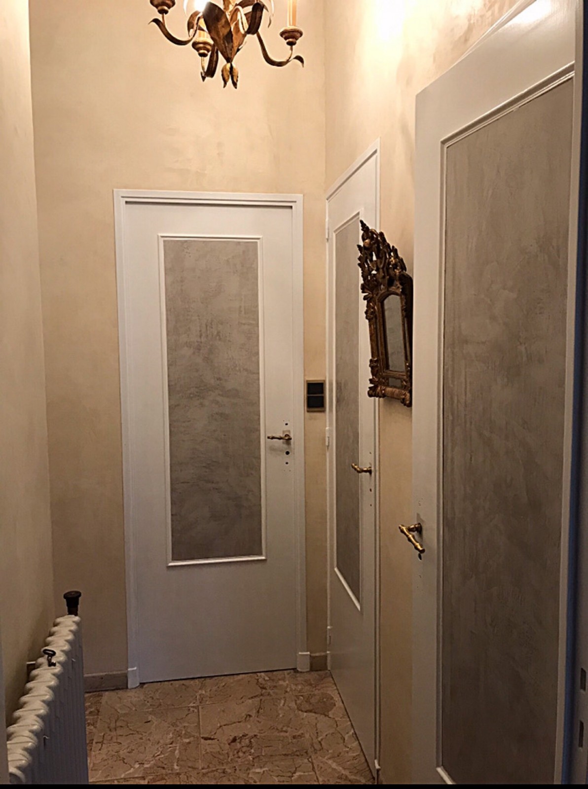 Cette cliente voulait poser du tissu mural. Nous lui avons suggéré d'appliquer un enduit à la chaux dans une chambre. En voyant le résultat, elle nous a demandé de décorer sa maison avec le même enduit. J'ai également proposé d'enduire le panneau central des portes avec du stucco.