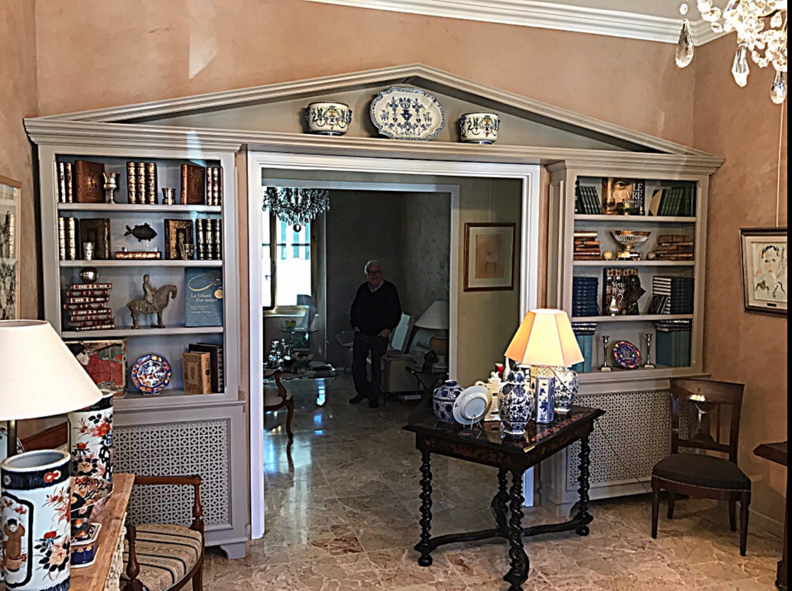 Pour mettre en valeur la bibliothèque du salon, nous avons choisi de la peindre en gris perle en contraste avec un enduit à la chaux de couleur marron .