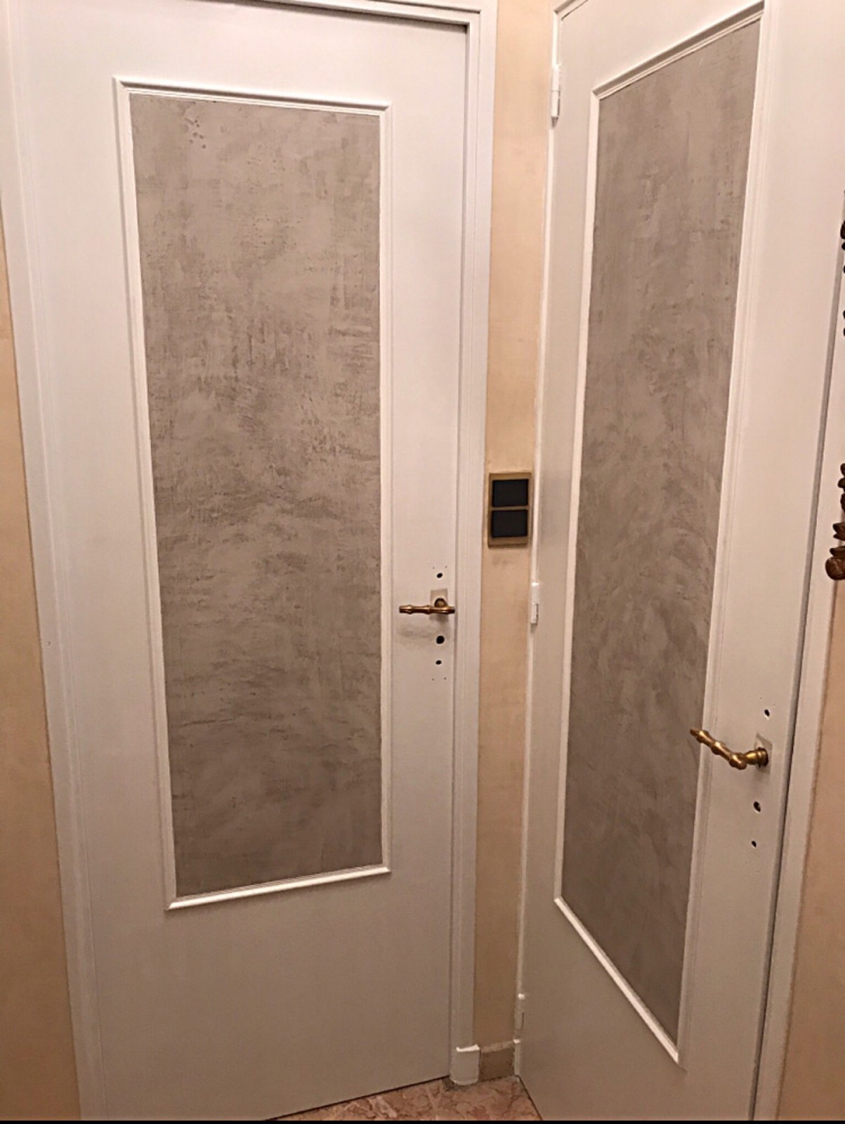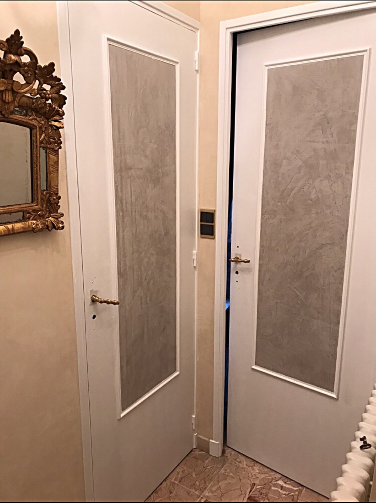 J'ai peint les portes avec de la peinture gris fusain et au milieu j'ai réalisé un stucco d'une couleur grise plus soutenue .