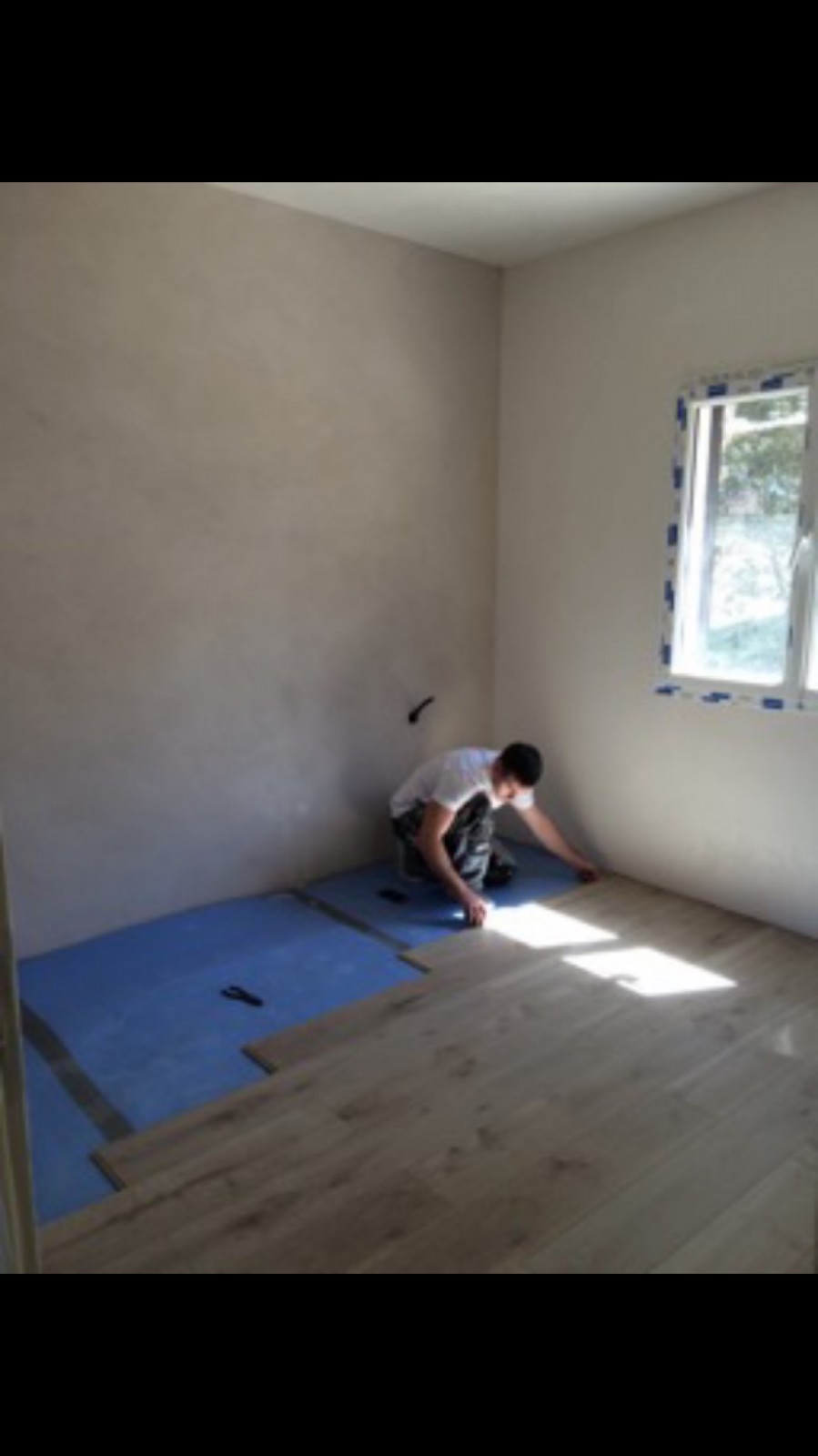 Sur chaque mur et plafond des chambres nous avons utilisé une couleur ton pierre et pour rehausser la décoration un mur de la couleur choisie par le client. Pour les murs et plafonds du couloir les reliant entre elles, une couleur chamois. Sur les sols nous avons posé un parquet flottant.