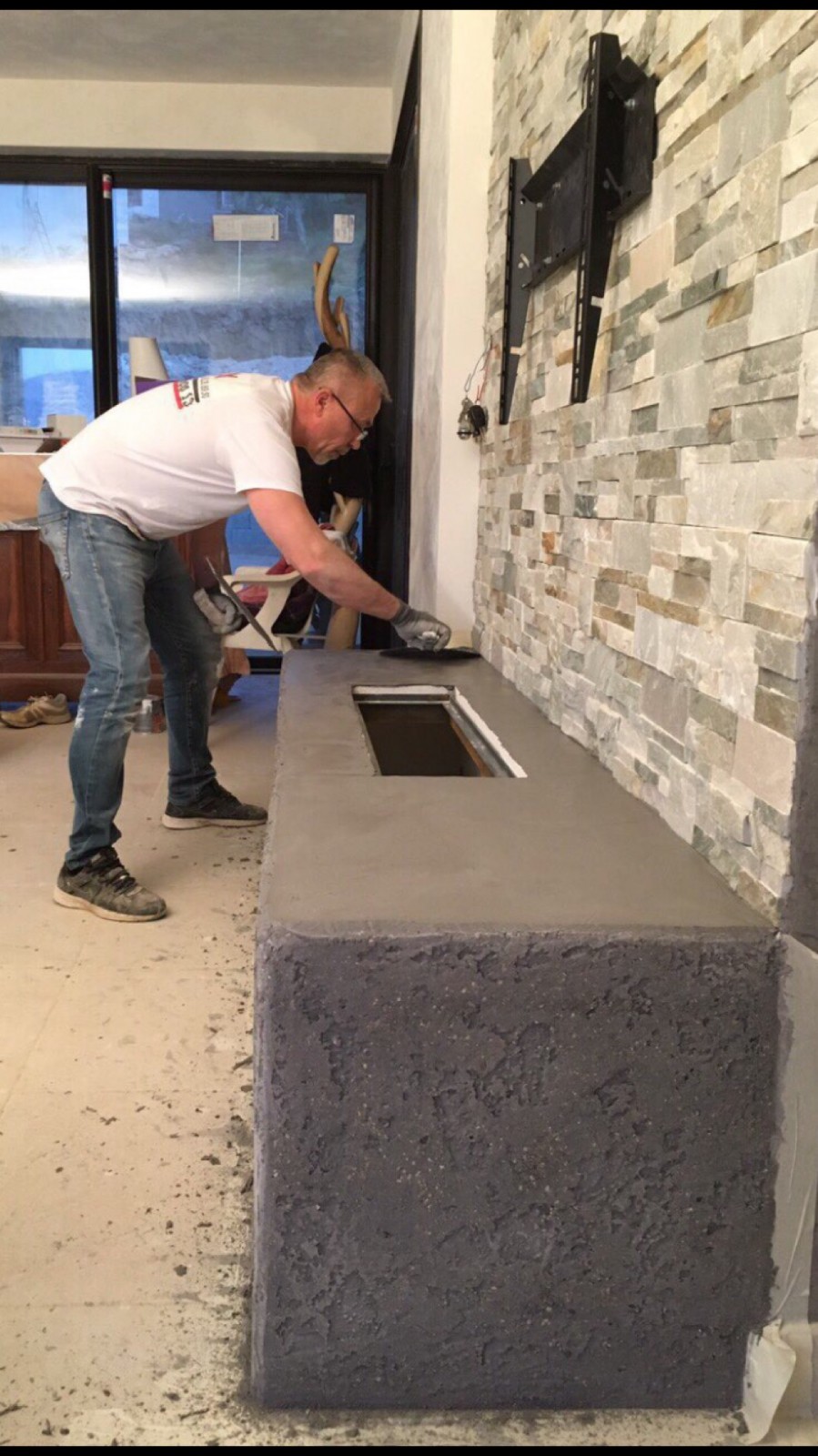 Au salon, nous avons habillé un meuble télé avec un enduit de la même couleur taupe que les murs de l'entrée.