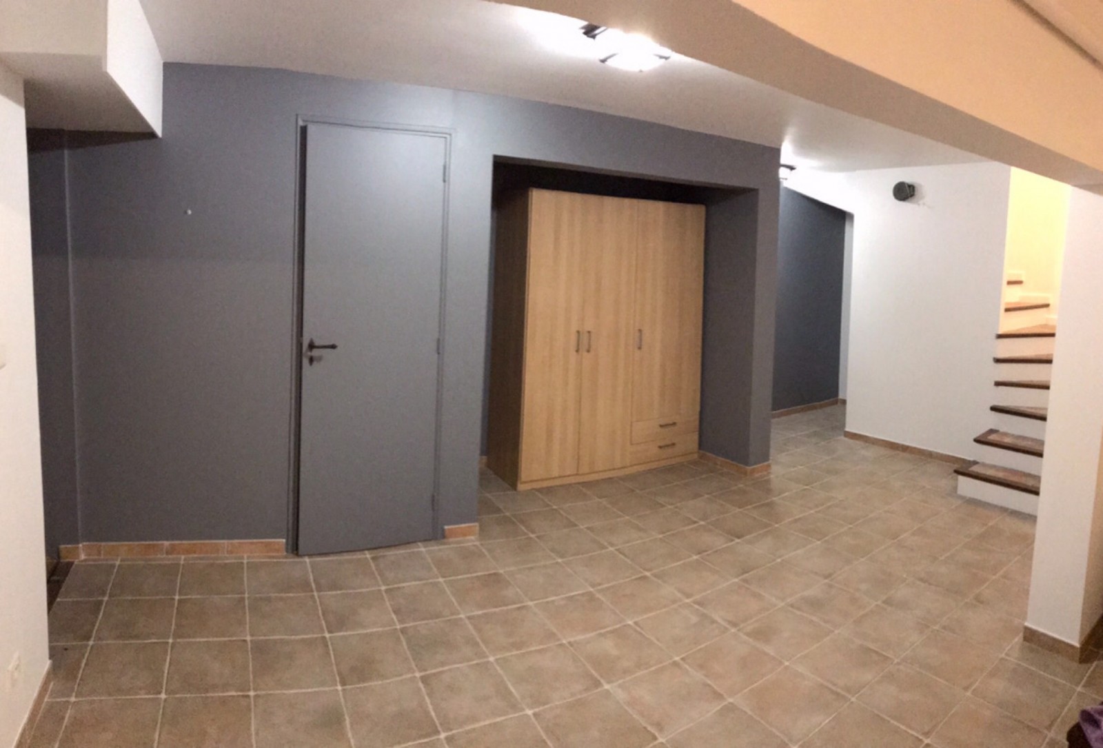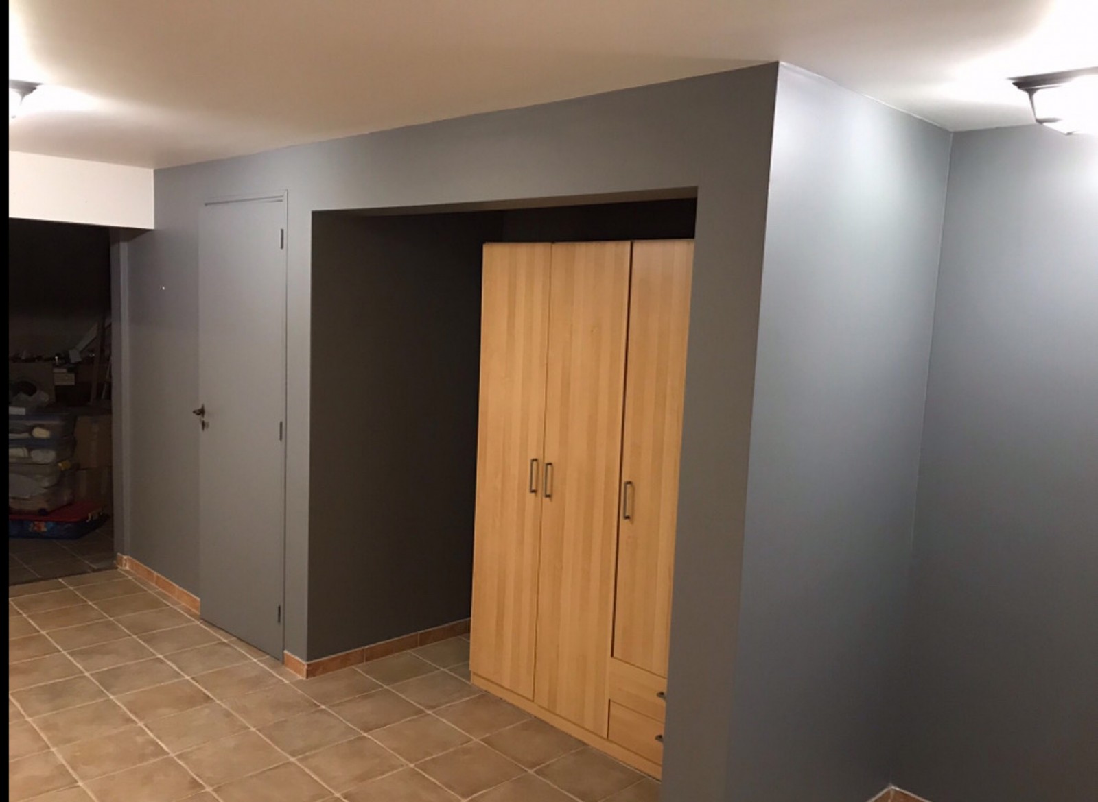 Au sous-sol, une peinture gris claire sur les murs et plafonds et pour donner plus de caractère et de profondeur, nous avons habillé un mur d’un gris plus soutenu.