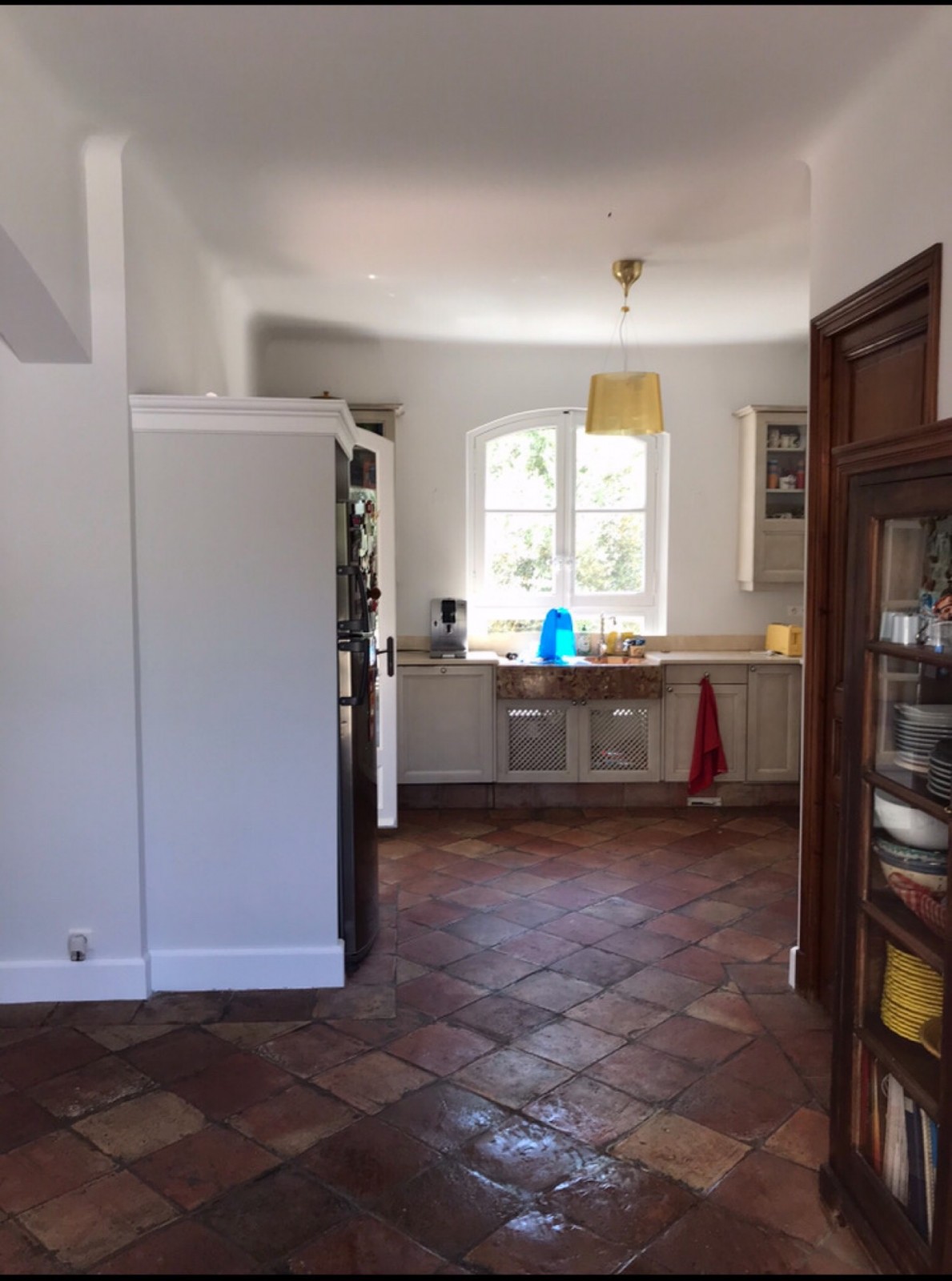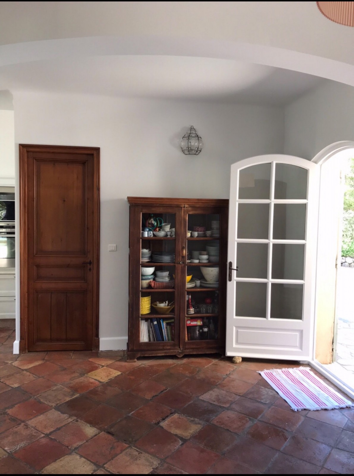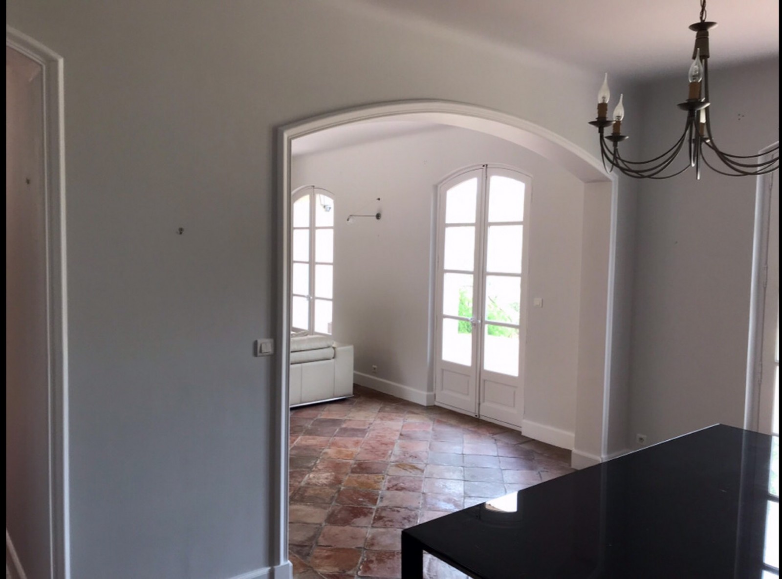 Sur les murs et plafonds du salon et ceux de la cuisine, nous avons appliqué une couleur gris clair qui tamise l’intensité de la lumière, et sur les portes fenêtres ainsi que sur les plinthes et encadrements, une laque blanc mate. Ces couleurs s’harmonisent parfaitement avec les tomettes du sol et des deux portes en chêne de l’entrée.