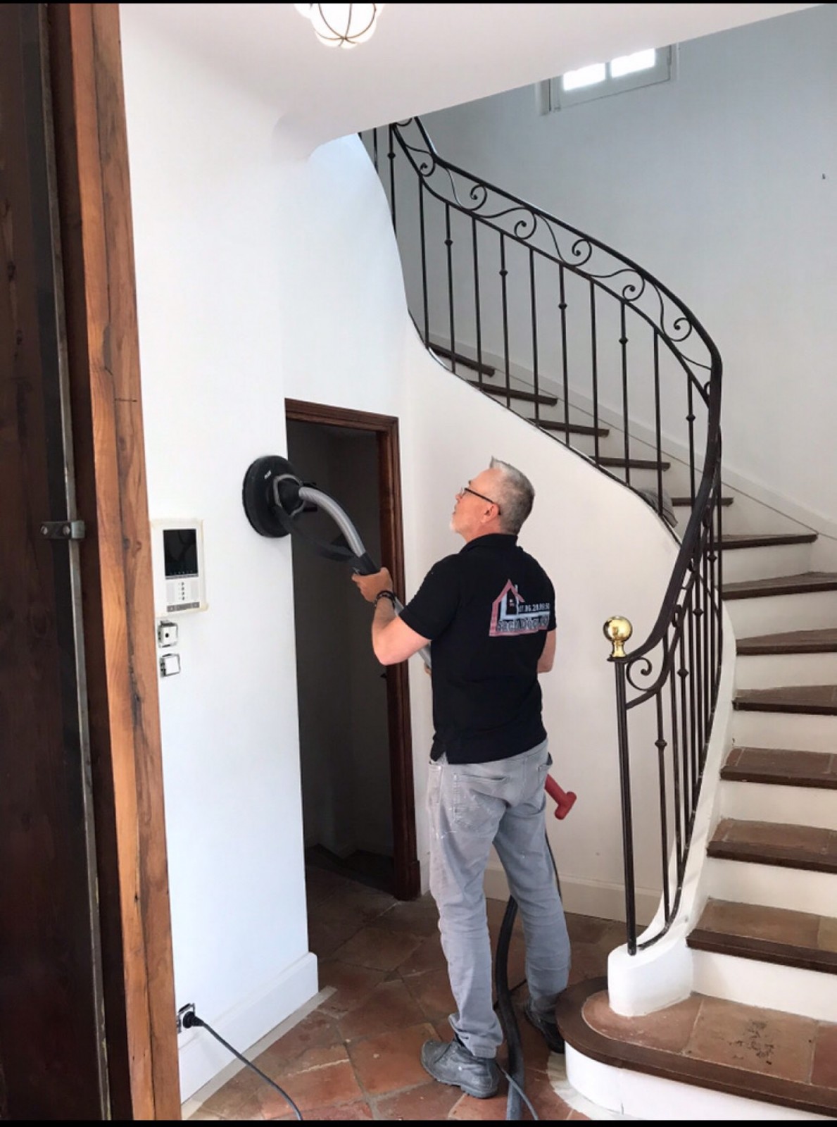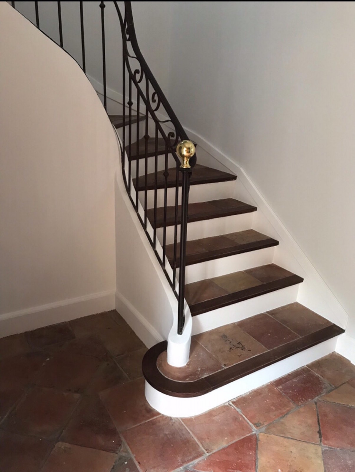 Pour la cage d’escalier qui monte vers les chambres, la même couleur gris clair sur les murs et plafond. Pour alléger la pesanteur des marches en carrelage de terre cuite, nous avons posé une laque blanc mat sur le limon et les contremarches de l’escalier.