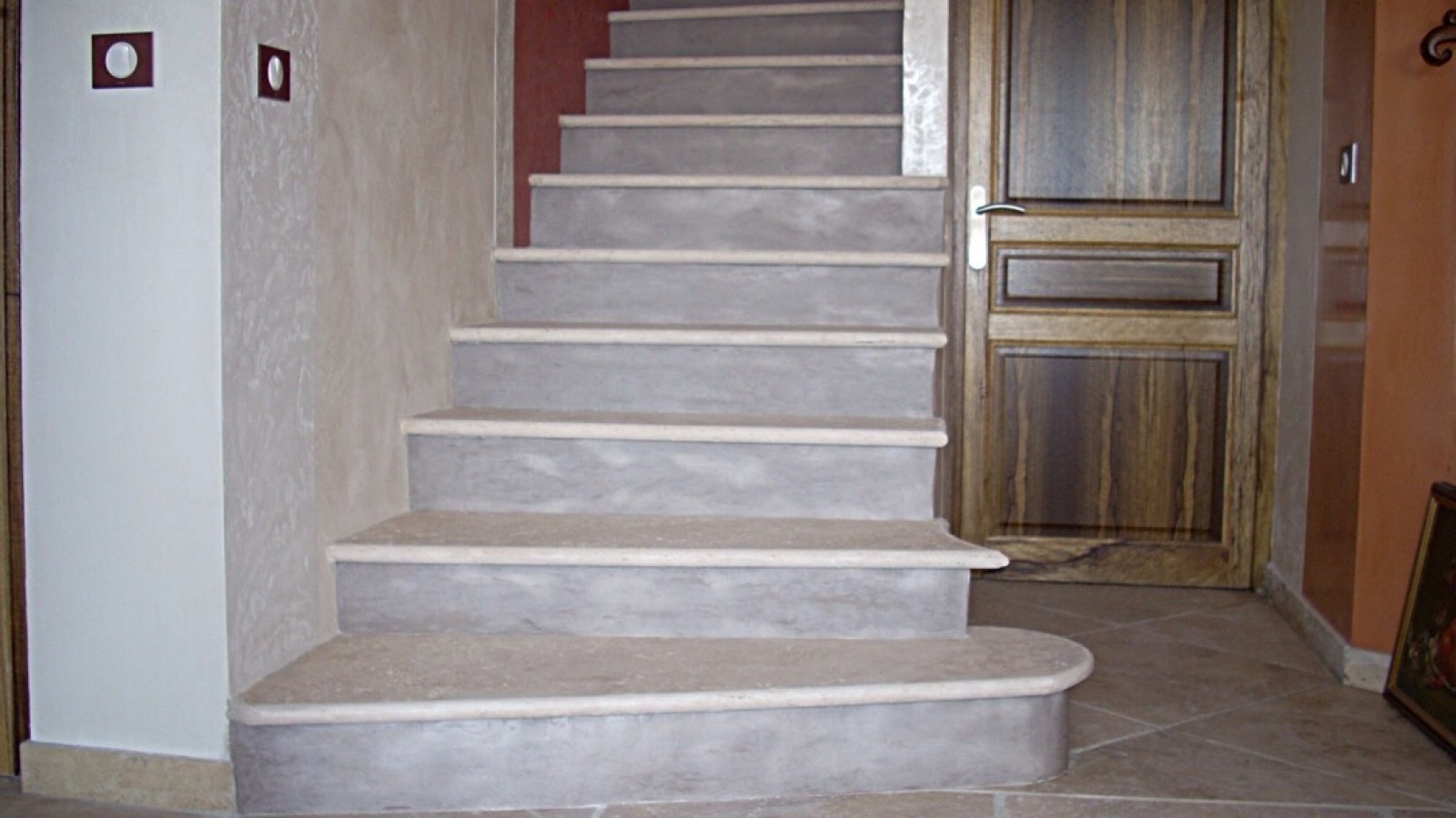 Dans l'escalier pour donner une touche finale à l'ensemble j'ai posé un tadelakt de couleur froide spécialement pour s'opposer aux couleurs chaudes de l'ensemble