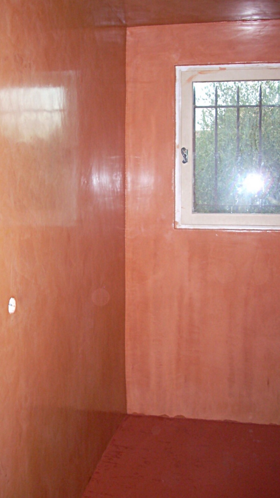 Dans l'entrée un panneau de tadelakt orange fes pour appeler la salle de bain au mur en tadelakt et au sol couleur rouge Pompéi