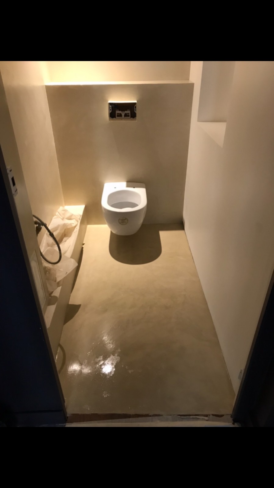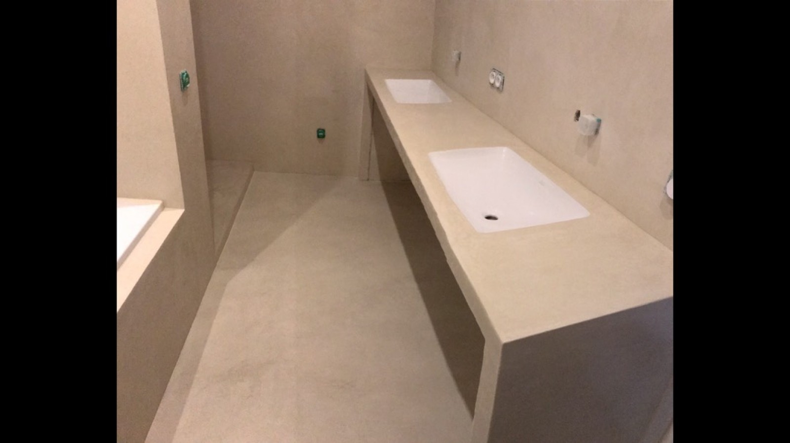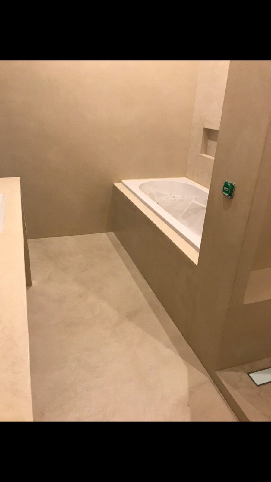Nous avons choisi avec le client une couleur Sahara 160 grammes pour le béton ciré du sol et un tadelakt de la même couleur pour l'ensemble.